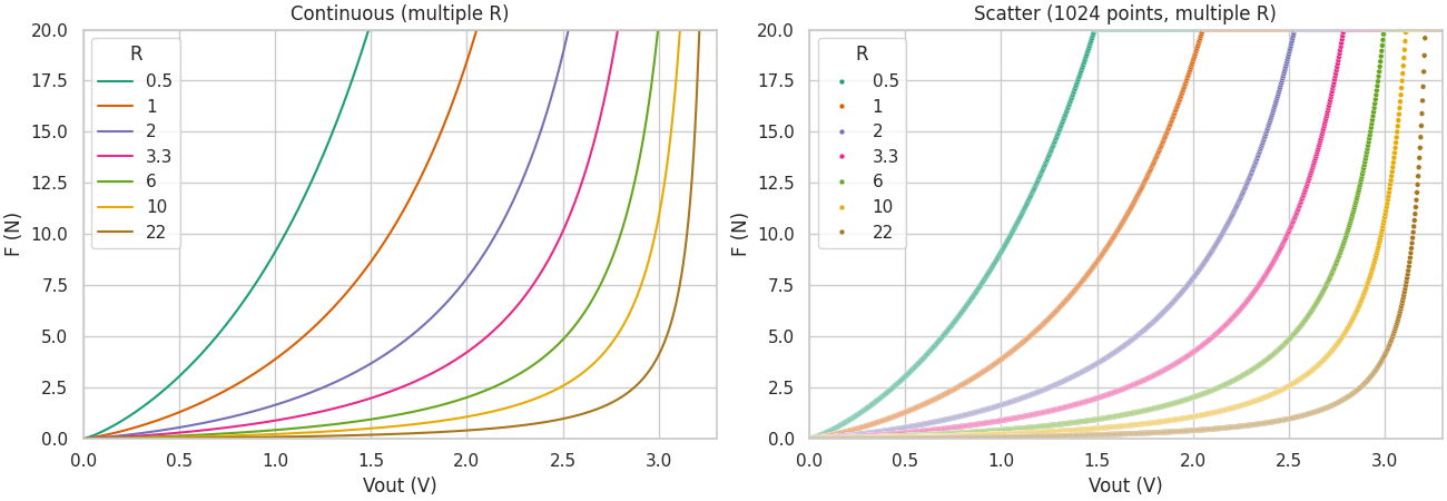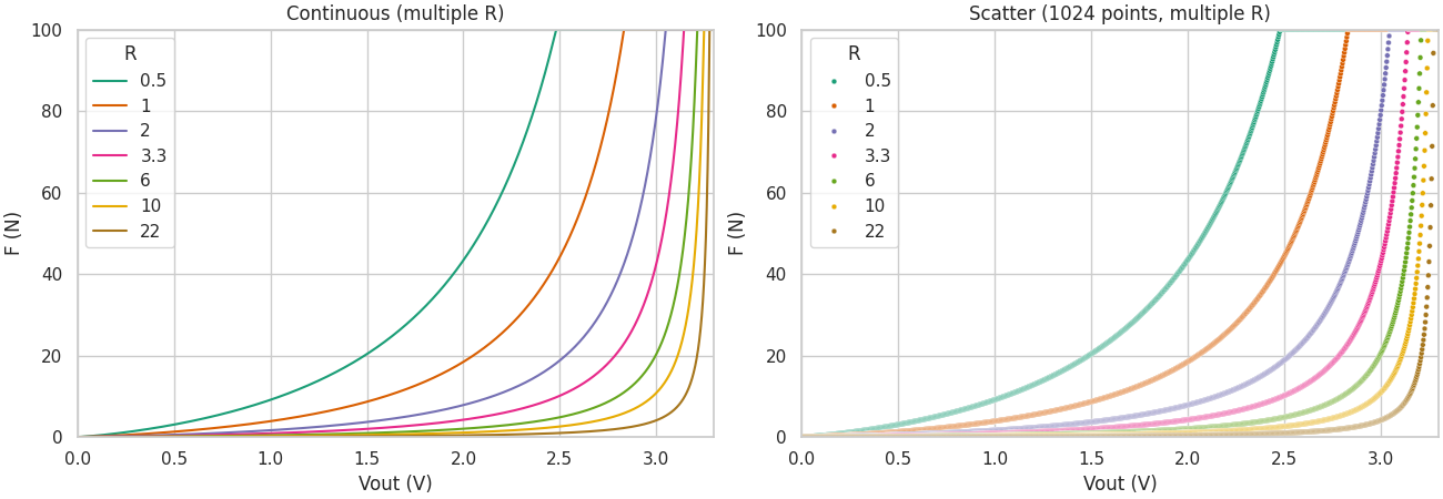 The resistance’s value choice affects the relation between the measured voltage for a given force input. Given the exponential relationship (Figure 3), we need to select \(R\) given a predefined input voltage and force range to maximize the measurement’s overall resolution.
