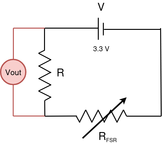 \[\begin{equation} \begin{split} V_{out} &= V_{in} \frac{R}{R + R_{FSR}} \\ R_{FSR} &= R(\frac{V{in} - V{out}}{V{in}}) \end{split} \end{equation}\]Replacing \(R_{FSR}\) with the equation of the previous section, we get: